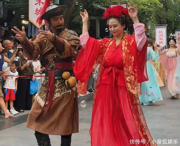 她穿着一身红色衣裳,头上别着红花和流苏,看起来像是被猫妖附身的新娘子,和景区的工作人员一块儿跳起舞来,场面特别热闹又精彩。